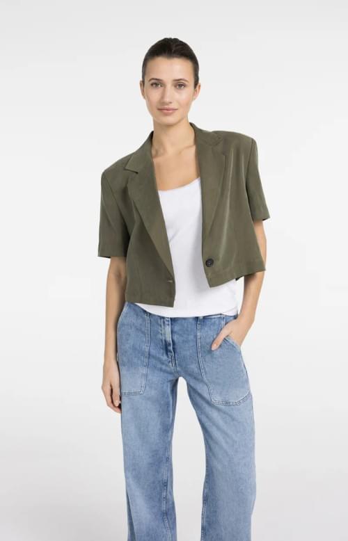 Ce blazer tendance à manches courtes a un col cranté à revers et une fermeture à bouton à lavant.