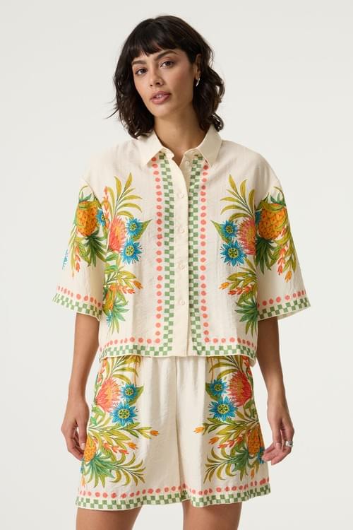 Cette blouse possède un col, des manches courtes et une coupe classique.