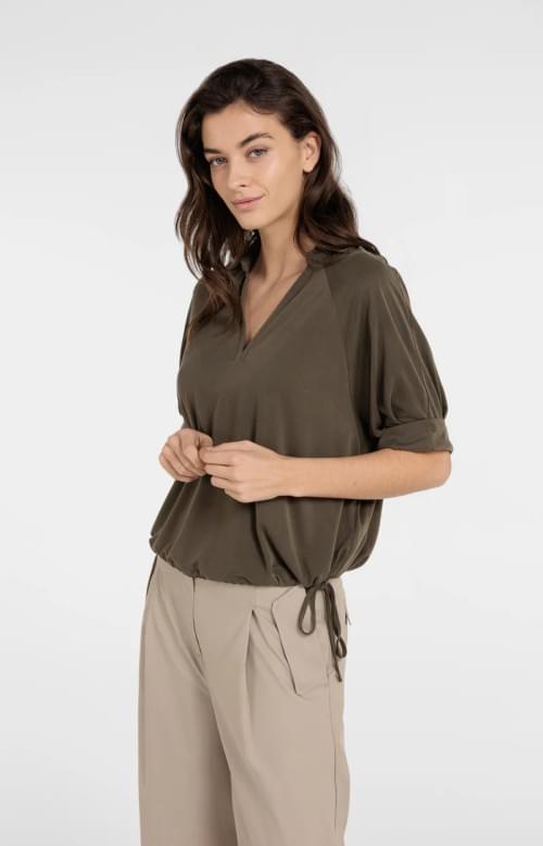 Cet élégant haut en jersey a une encolure en V plongeante avec col et manches courtes subtilement plissées.