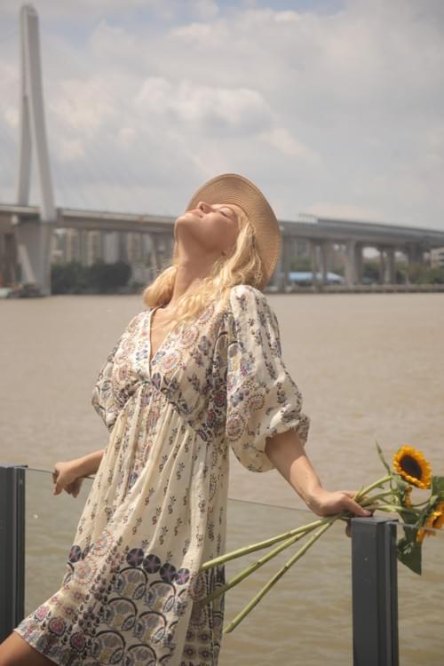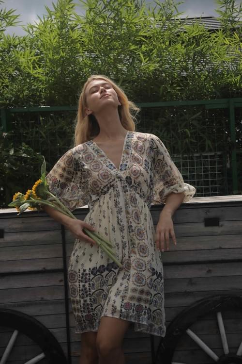 ROBE IMPRIMÉE COURTE COL V MANCHES 3/4 100% LIN