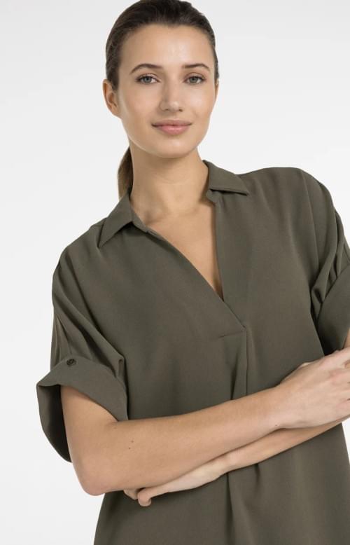 Cette élégante robe col V a des manches courtes légèrement plissées et une coupe ample.